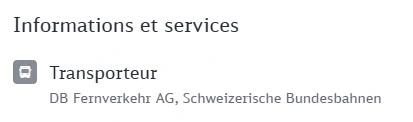 Vous pouvez rechercher des trains à l’aide du planificateur de voyage. Dans la section Informations supplémentaires de chaque train, l’opérateur (Transporteur) est indiqué. Pour les liaisons transfrontalières, plusieurs opérateurs sont souvent impliqués.